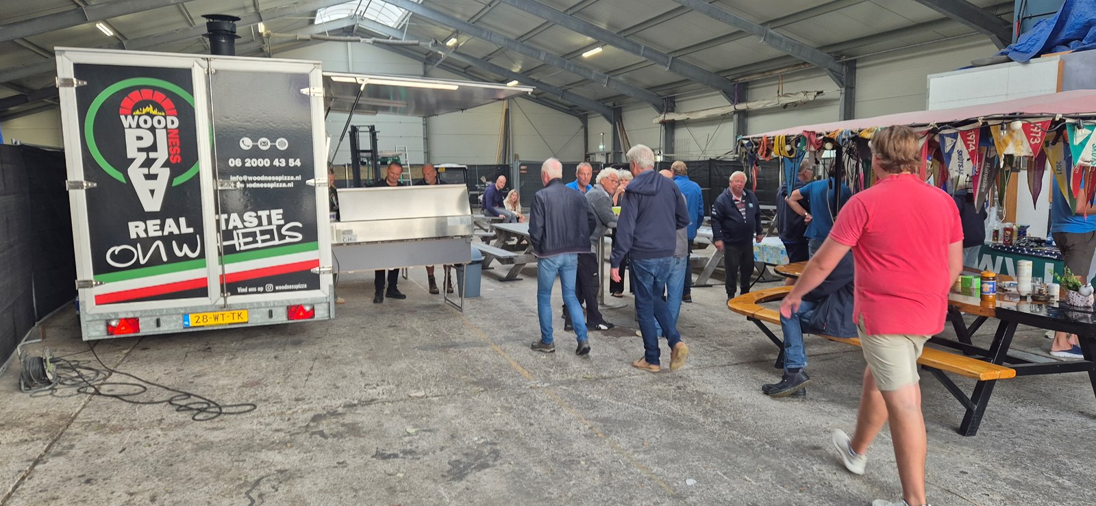 Maar gelukkig lijkt het een hele mooie dag te worden, met een mooi lopend windje, soms hangen, soms kantje boord. Jan waarschuwt nog even dat we met de zuid-zuidwest baan net na de start de vaargeul doorkruisen en dat die bootjes toch echt wel voorrang hebben, maar verder staat ons niks in de weg om voor de lunch 2 potjes te zeilen en na de lunch nogmaals 2 potjes, om dan uiteindelijk mooi op tijd weer aan wal te zijn voor de ovenverse pizza’s van pizzabakker Hendrik, die we nog kennen van de editie van 2024 bij Reinout op de haven.